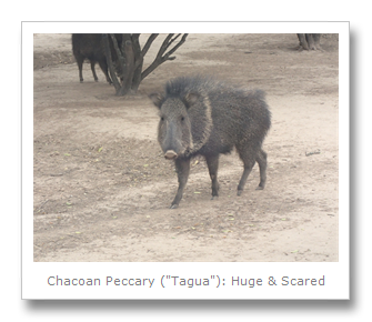 The Chacoan Peccary is also called the “tagua,” and it is the largest of the three types of peccary in the project. Scientists believed this species was extinct for 15,000 years until 1975 when it was spotted by Dr. Ralph Wetzel. (See this LA Times article.) This peccary were really freaked by us being around and they reminded me of scared cows who just stand in the field and stare at you for ages.