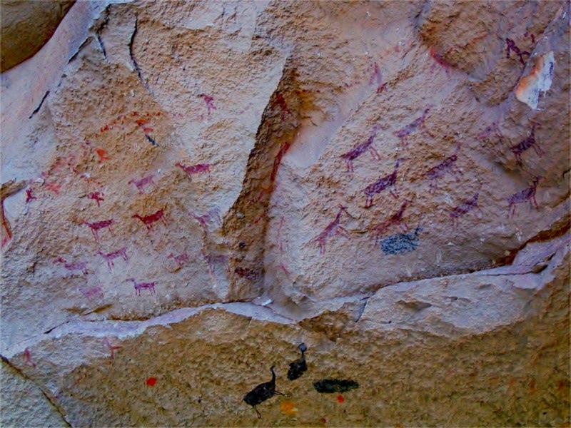 Stylistic Group B is the second group of art around 7,000 years before present until 3,300 years before present. It is this group that created the hands stencils the cave is known for (including one 6 fingered hand, strangely, similar to a 6 fingered hand art image we saw in Brazil at Sete Cidades) along with stencils of rhea feet and puma paws. Some of the later art included zoomorphic and anthropomorphic drawings as well.
