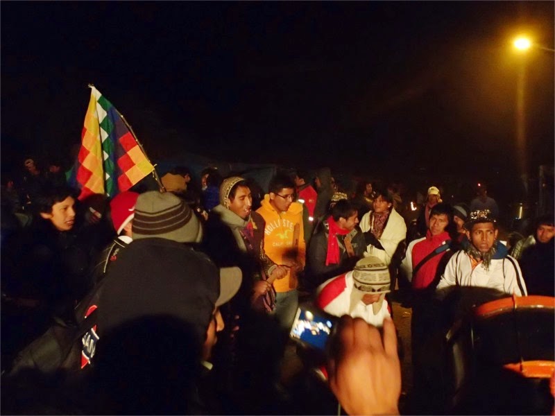 Once we arrived at the festival, we got our blankets and cooking supplies out of the car and walked towards the giant plume of smoke we saw ahead in the distance. Once we reached the celebration we set ourselves around one of the bonfires. The group's cook made us hot dogs with ketchup on them, along with hot drinks throughout the evening. There was even a bit of whiskey being passed around. One of the guides pulled me up from the fire and brought me to the dancing circle which had formed around the band playing charangos. He taught me the local dances and we had a lot of fun while waiting for the sun to come up.